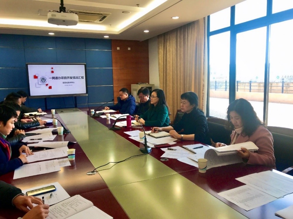 “一网通办”专项工作推进小组成员参加会议。会议由党办主任孙劼主持。信息化技术中心主任张小全围绕“一网通办(一期)”项目的整体推进情况和存在问题进行了汇报。与会人员对“一网通办”的平台和流程开展了交流和讨论,同时也提出了开发“一网通办”部门管理员体系,进一步推进跨部门业务开发等宝贵建议。