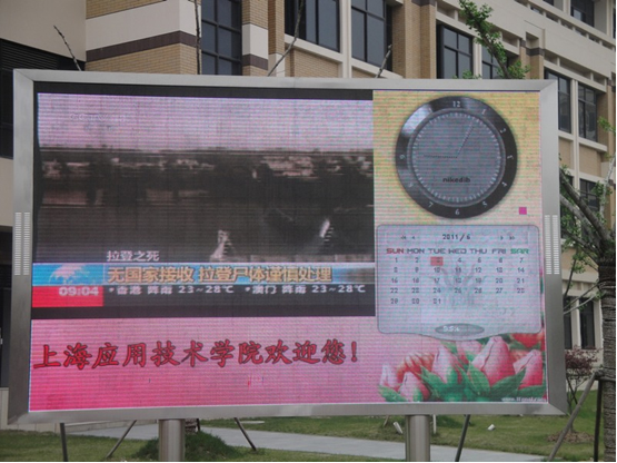 本项目由一块16.4平方米的室外三基色全彩屏、三块10.3平方米室外双基色屏、9块室内52寸LCD屏及一套集中发布系统组成。可以通过显示屏发布信息、图像、动画、视频等,并可以在同一屏幕上任意编辑、组合显示的信息。系统覆盖了学校正门、东大门、一食堂、二食堂的室外区域,和建安楼、机电楼、教学楼、图书馆等建筑的室内公共区域。