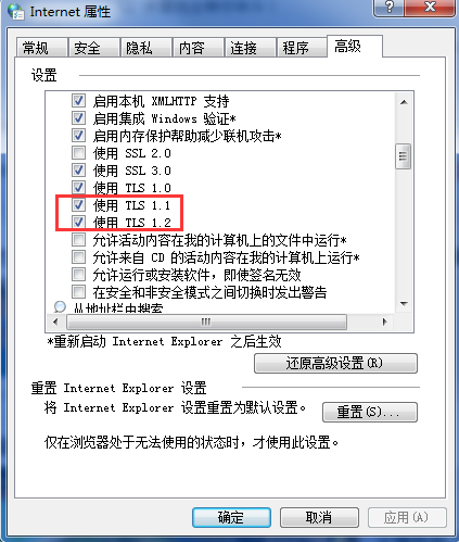 途径2、如果使用360或者IE浏览器低版本的用户,出现学校主页打不开的情况时,请打开ie或360浏览器,按照下面的截图,去勾选下tls1.1和1.2,设置好后清除浏览器的缓存,浏览器就可以正常访问学校主页了。